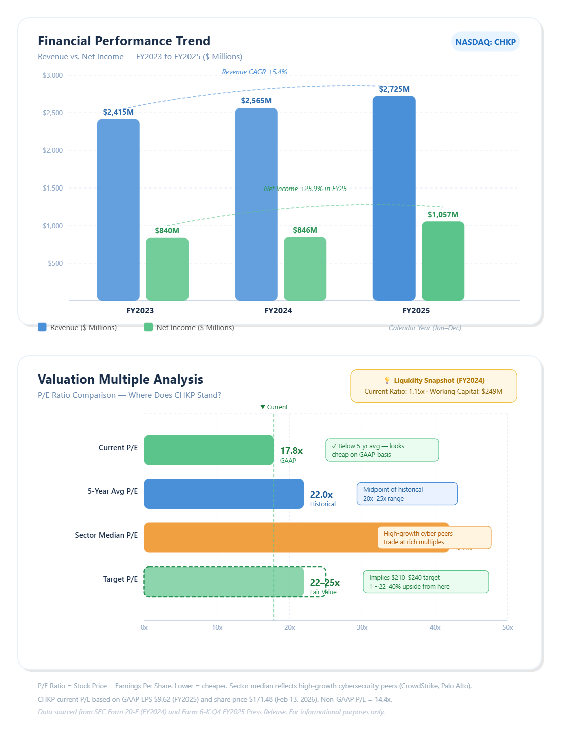 P/E Ratio: At $171.48 and GAAP EPS of $9.62, you’re paying about 17.8x earnings. On Non-GAAP EPS of $11.89, it’s closer to 14.4x. For context, Check Point’s 5-year average P/E has typically ranged between 20x and 25x. At 17-18x GAAP earnings today, this is one of the cheapest it’s been in a long time. The cybersecurity sector median P/E trades closer to 40-50x for high-growth names (think CrowdStrike, Palo Alto). Check Point’s multiple is so low because the market doesn’t give it a “growth stock” premium — but it also means the downside is limited.