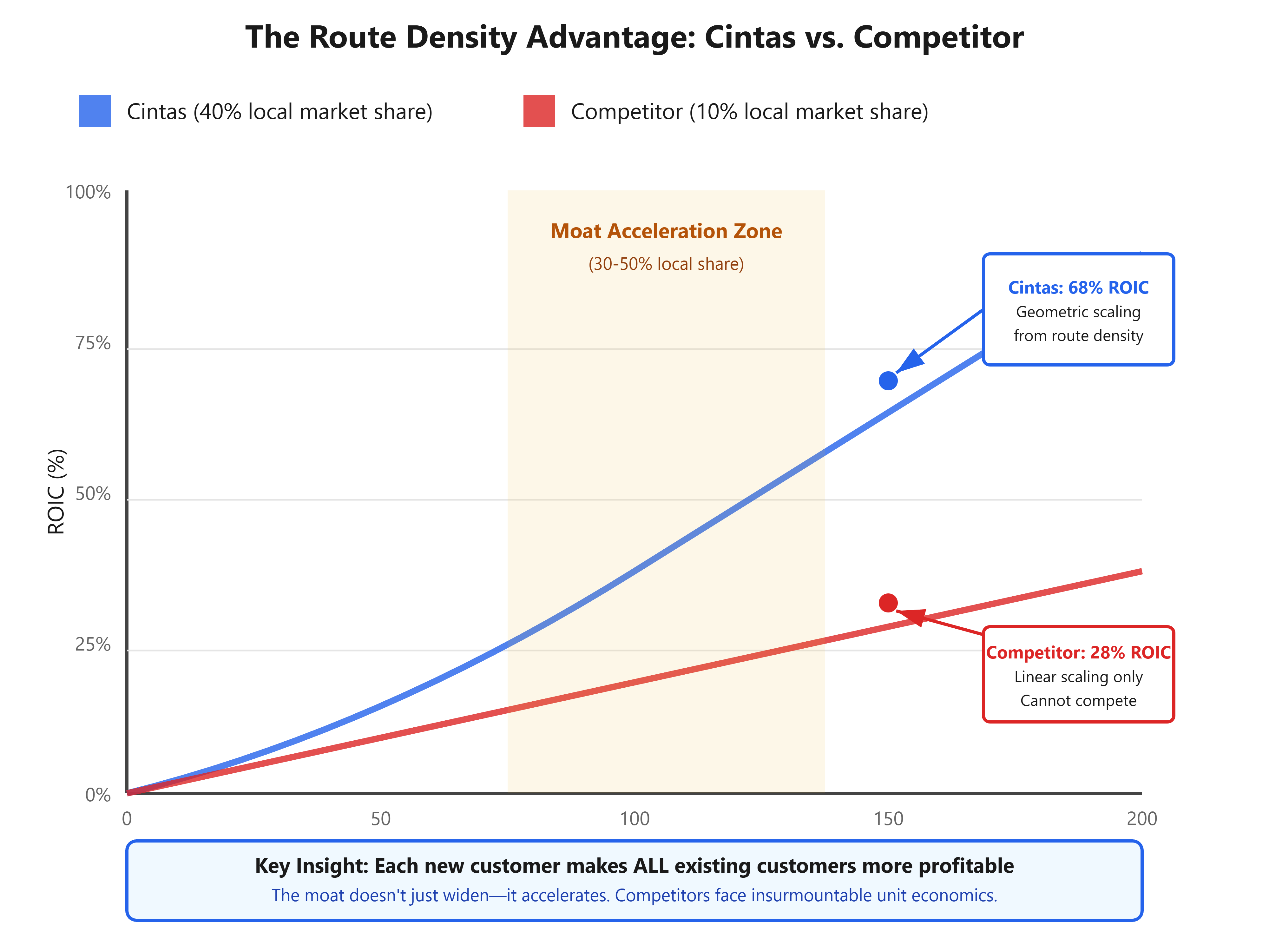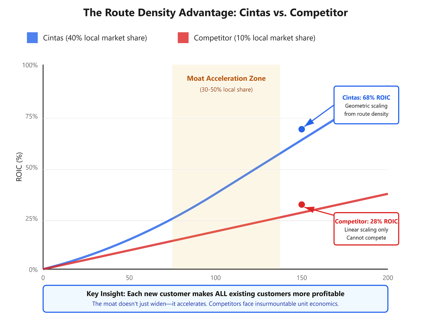 Traditional businesses face declining marginal returns: the 100th customer generates less incremental profit than the 10th. Route-based businesses like Cintas invert this principle entirely.