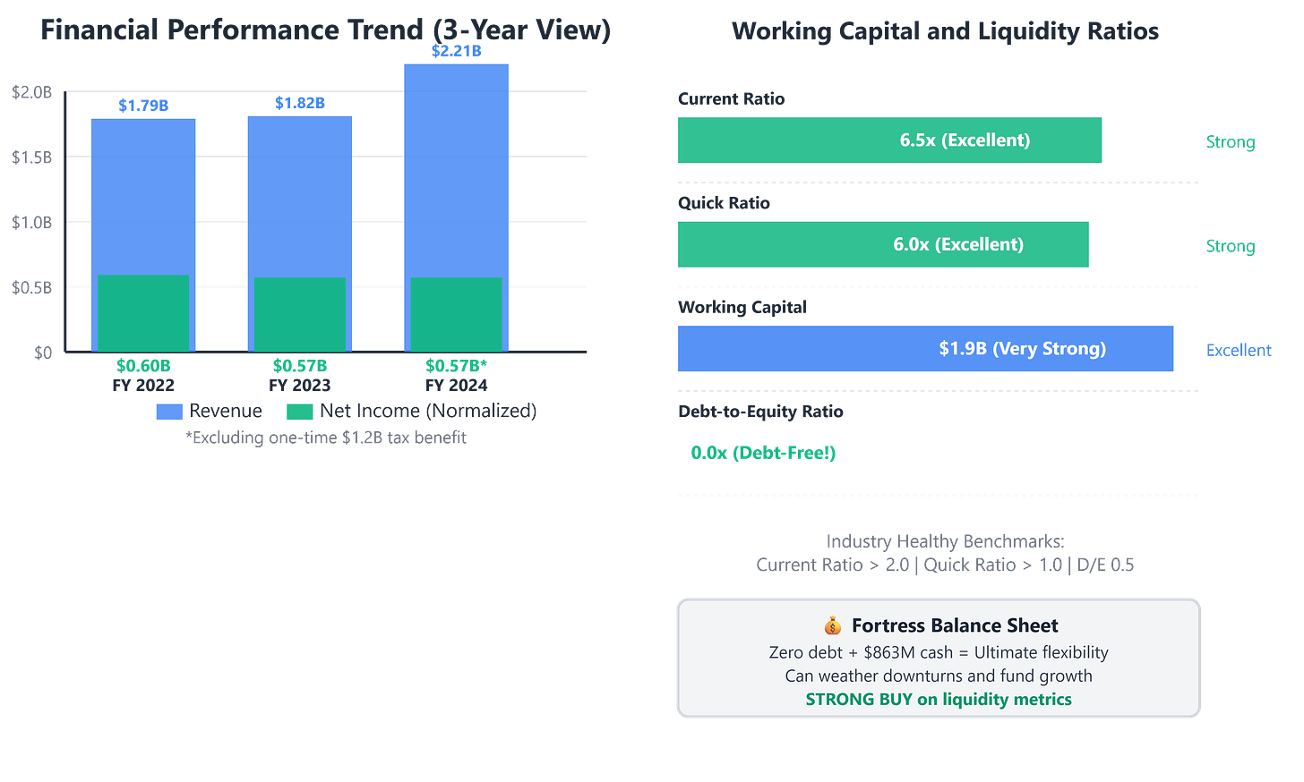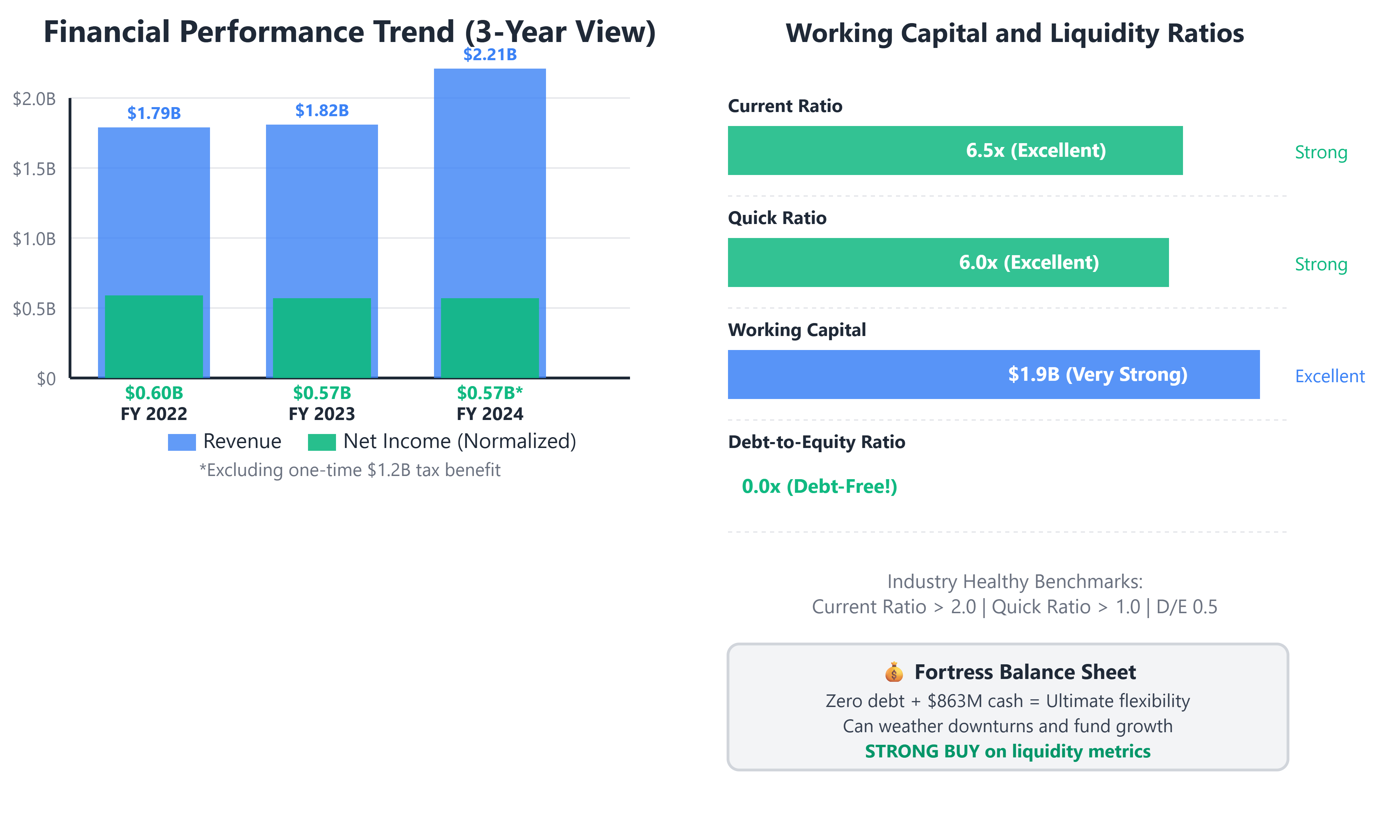 Working Capital Ratios: The company has about $2.2 billion in current assets against only $337 million in current liabilities. That gives them a current ratio of roughly 6.5. In plain English, they have $6.50 of liquid assets for every dollar they owe in the next year. Anything above 2.0 is considered healthy. This is exceptional.