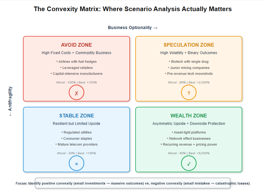 The sophisticated approach isn’t building better scenarios; it’s understanding which business characteristics create asymmetric payoff structures where best cases deliver exponential returns while worst cases inflict linear losses. This distinction separates generational wealth creators from index huggers.