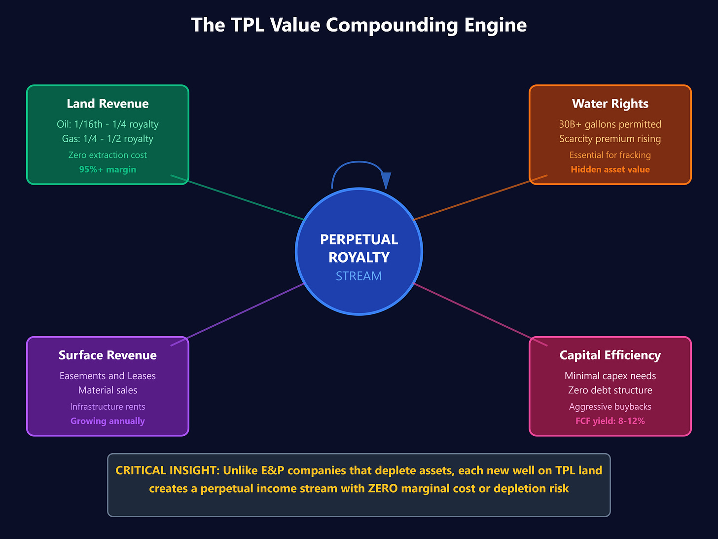 Here’s the insight Wall Street consistently overlooks: TPL operates the inverse business model of traditional energy companies. While E&P firms burn capital to produce depleting assets, TPL collects perpetual royalties on 880,000 surface acres without spending a dollar on extraction. This creates a capital efficiency profile so extreme it breaks conventional valuation models.
